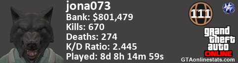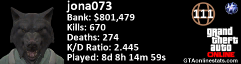 [URL=http://GTAonlinestats.com/showplayer/jona073][IMG]http://GTAonlinestats.com/signature/jona073/sig.png[/IMG][/URL]