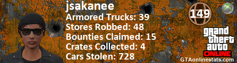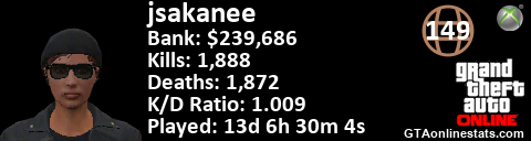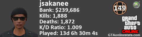 <a href="http://GTAonlinestats.com/showplayer/jsakanee"><img src="http://GTAonlinestats.com/signature/jsakanee/sig.png" alt="jsakanee" border="0" /></a>