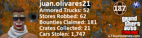 <a href="http://GTAonlinestats.com/showplayer/juan.olivares21"><img src="http://GTAonlinestats.com/crimesignature/juan.olivares21/sig.png" alt="Juan.Olivares21" border="0" /></a>