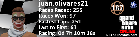 [URL=http://GTAonlinestats.com/showplayer/juan.olivares21][IMG]http://GTAonlinestats.com/racesignature/juan.olivares21/sig.png[/IMG][/URL]