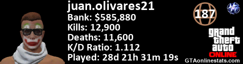 [URL=http://GTAonlinestats.com/showplayer/juan.olivares21][IMG]http://GTAonlinestats.com/greysignature/juan.olivares21/sig.png[/IMG][/URL]