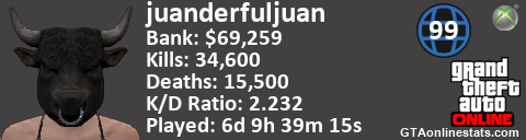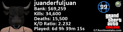 [URL=http://GTAonlinestats.com/showplayer/juanderfuljuan/3][IMG]http://GTAonlinestats.com/signature/juanderfuljuan/3/sig.png[/IMG][/URL]