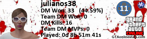 [URL=http://GTAonlinestats.com/showplayer/julianos38/2][IMG]http://GTAonlinestats.com/dmsignature/julianos38/2/sig.png[/IMG][/URL]