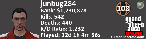 <a href="http://GTAonlinestats.com/showplayer/junbug284"><img src="http://GTAonlinestats.com/signature/junbug284/sig.png" alt="junbug284" border="0" /></a>