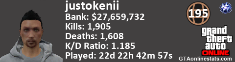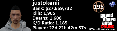 [URL=http://GTAonlinestats.com/showplayer/justokenii][IMG]http://GTAonlinestats.com/dmsignature/justokenii/sig.png[/IMG][/URL]