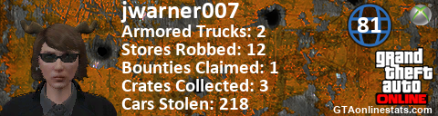 [URL=http://GTAonlinestats.com/showplayer/jwarner007/2][IMG]http://GTAonlinestats.com/crimesignature/jwarner007/2/sig.png[/IMG][/URL]