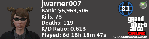 <a href="http://GTAonlinestats.com/showplayer/jwarner007/2"><img src="http://GTAonlinestats.com/dmsignature/jwarner007/2/sig.png" alt="jwarner007" border="0" /></a>