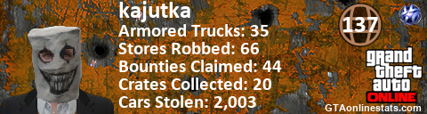 [URL=http://GTAonlinestats.com/showplayer/kajutka][IMG]http://GTAonlinestats.com/crimesignature/kajutka/sig.png[/IMG][/URL]