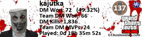 [URL=http://GTAonlinestats.com/showplayer/kajutka][IMG]http://GTAonlinestats.com/dmsignature/kajutka/sig.png[/IMG][/URL]