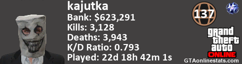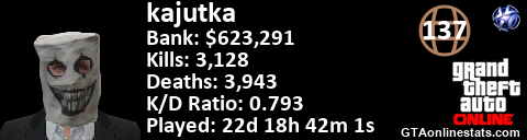 [URL=http://GTAonlinestats.com/showplayer/kajutka][IMG]http://GTAonlinestats.com/greysignature/kajutka/sig.png[/IMG][/URL]