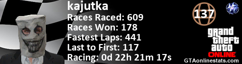 [URL=http://GTAonlinestats.com/showplayer/kajutka][IMG]http://GTAonlinestats.com/racesignature/kajutka/sig.png[/IMG][/URL]