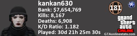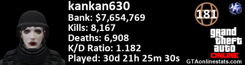 [URL=http://GTAonlinestats.com/showplayer/kankan630/2][IMG]http://GTAonlinestats.com/signature/kankan630/2/sig.png[/IMG][/URL]