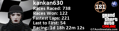 [URL=http://GTAonlinestats.com/showplayer/kankan630/2][IMG]http://GTAonlinestats.com/racesignature/kankan630/2/sig.png[/IMG][/URL]