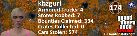 [URL=http://GTAonlinestats.com/showplayer/kbzgurl/2][IMG]http://GTAonlinestats.com/crimesignature/kbzgurl/2/sig.png[/IMG][/URL]