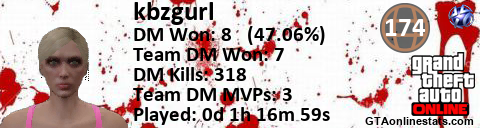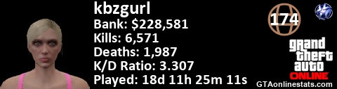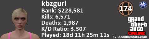 [URL=http://GTAonlinestats.com/showplayer/kbzgurl/2][IMG]http://GTAonlinestats.com/randomsignature/kbzgurl/2/sig.png[/IMG][/URL]