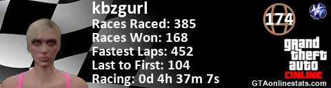[URL=http://GTAonlinestats.com/showplayer/kbzgurl/2][IMG]http://GTAonlinestats.com/racesignature/kbzgurl/2/sig.png[/IMG][/URL]