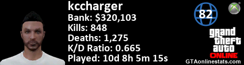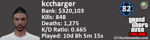 [URL=http://GTAonlinestats.com/showplayer/kccharger][IMG]http://GTAonlinestats.com/signature/kccharger/sig.png[/IMG][/URL]