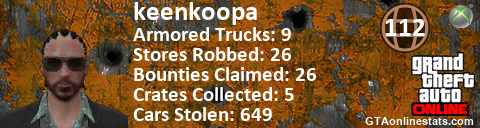 [URL=http://GTAonlinestats.com/showplayer/keenkoopa][IMG]http://GTAonlinestats.com/dmsignature/keenkoopa/sig.png[/IMG][/URL]