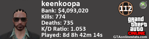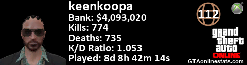 <a href="http://GTAonlinestats.com/showplayer/keenkoopa"><img src="http://GTAonlinestats.com/signature/keenkoopa/sig.png" alt="keenkoopa" border="0" /></a>