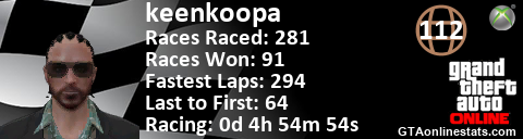 [URL=http://GTAonlinestats.com/showplayer/keenkoopa][IMG]http://GTAonlinestats.com/racesignature/keenkoopa/sig.png[/IMG][/URL]