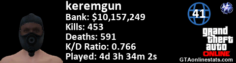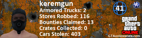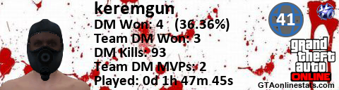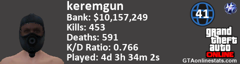 [URL=http://GTAonlinestats.com/showplayer/keremgun][IMG]http://GTAonlinestats.com/signature/keremgun/sig.png[/IMG][/URL]