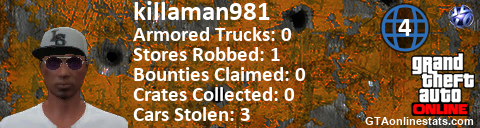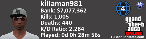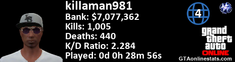 <a href="http://GTAonlinestats.com/showplayer/killaman981/3"><img src="http://GTAonlinestats.com/randomsignature/killaman981/3/sig.png" alt="killaman981" border="0" /></a>