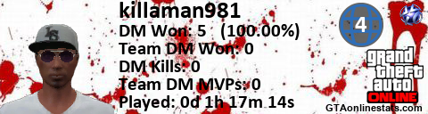 <a href="http://GTAonlinestats.com/showplayer/killaman981/3"><img src="http://GTAonlinestats.com/dmsignature/killaman981/3/sig.png" alt="killaman981" border="0" /></a>
