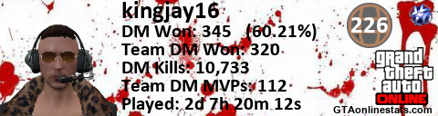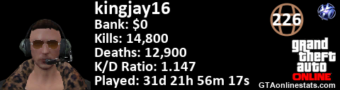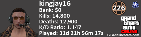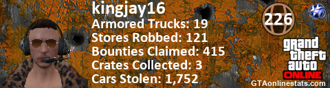 <a href="http://GTAonlinestats.com/showplayer/kingjay16"><img src="http://GTAonlinestats.com/randomsignature/kingjay16/sig.png" alt="kingjay16" border="0" /></a>