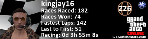 [URL=http://GTAonlinestats.com/showplayer/kingjay16][IMG]http://GTAonlinestats.com/racesignature/kingjay16/sig.png[/IMG][/URL]