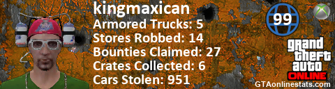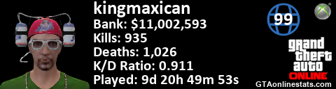 <a href="http://GTAonlinestats.com/showplayer/kingmaxican"><img src="http://GTAonlinestats.com/randomsignature/kingmaxican/sig.png" alt="kingmaxican" border="0" /></a>