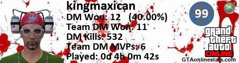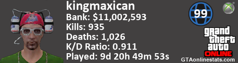 <a href="http://GTAonlinestats.com/showplayer/kingmaxican"><img src="http://GTAonlinestats.com/dmsignature/kingmaxican/sig.png" alt="kingmaxican" border="0" /></a>