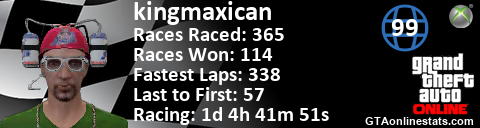 [URL=http://GTAonlinestats.com/showplayer/kingmaxican][IMG]http://GTAonlinestats.com/racesignature/kingmaxican/sig.png[/IMG][/URL]