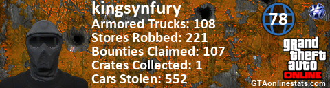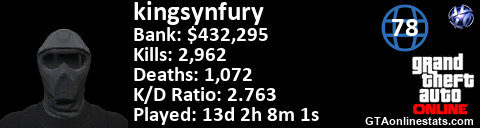 <a href="http://GTAonlinestats.com/showplayer/kingsynfury"><img src="http://GTAonlinestats.com/randomsignature/kingsynfury/sig.png" alt="kingsynfury" border="0" /></a>
