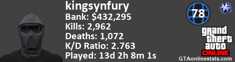 [URL=http://GTAonlinestats.com/showplayer/kingsynfury][IMG]http://GTAonlinestats.com/randomsignature/kingsynfury/sig.png[/IMG][/URL]