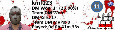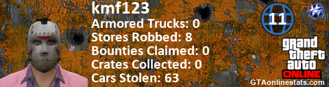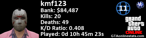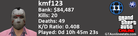 <a href="http://GTAonlinestats.com/showplayer/kmf123"><img src="http://GTAonlinestats.com/randomsignature/kmf123/sig.png" alt="kmf123" border="0" /></a>