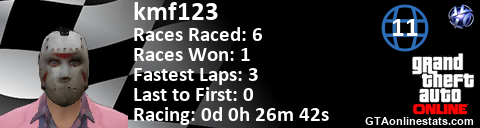 <a href="http://GTAonlinestats.com/showplayer/kmf123"><img src="http://GTAonlinestats.com/racesignature/kmf123/sig.png" alt="kmf123" border="0" /></a>