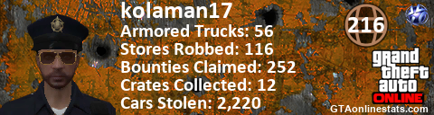 <a href="http://GTAonlinestats.com/showplayer/kolaman17"><img src="http://GTAonlinestats.com/randomsignature/kolaman17/sig.png" alt="kolaman17" border="0" /></a>