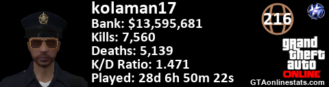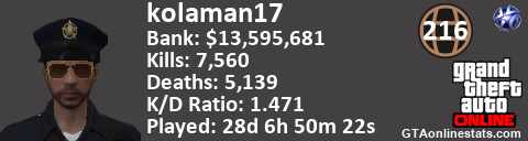 <a href="http://GTAonlinestats.com/showplayer/kolaman17"><img src="http://GTAonlinestats.com/signature/kolaman17/sig.png" alt="kolaman17" border="0" /></a>