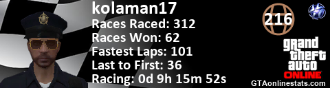 [URL=http://GTAonlinestats.com/showplayer/kolaman17][IMG]http://GTAonlinestats.com/racesignature/kolaman17/sig.png[/IMG][/URL]