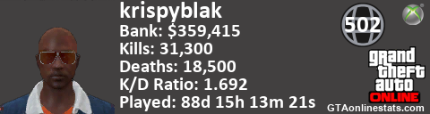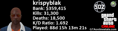 <a href="http://GTAonlinestats.com/showplayer/krispyblak"><img src="http://GTAonlinestats.com/signature/krispyblak/sig.png" alt="krispyblak" border="0" /></a>