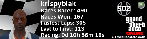 <a href="http://GTAonlinestats.com/showplayer/krispyblak"><img src="http://GTAonlinestats.com/racesignature/krispyblak/sig.png" alt="krispyblak" border="0" /></a>