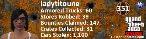 <a href="http://GTAonlinestats.com/showplayer/ladytitoune"><img src="http://GTAonlinestats.com/randomsignature/ladytitoune/sig.png" alt="LadyTitoune" border="0" /></a>