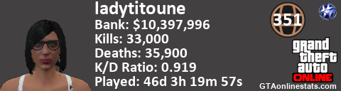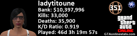 [URL=http://GTAonlinestats.com/showplayer/ladytitoune][IMG]http://GTAonlinestats.com/dmsignature/ladytitoune/sig.png[/IMG][/URL]