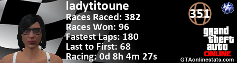 <a href="http://GTAonlinestats.com/showplayer/ladytitoune"><img src="http://GTAonlinestats.com/racesignature/ladytitoune/sig.png" alt="LadyTitoune" border="0" /></a>