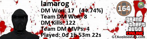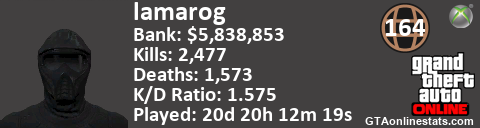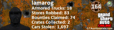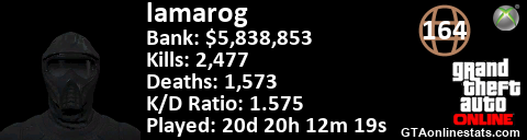 <a href="http://GTAonlinestats.com/showplayer/lamarog"><img src="http://GTAonlinestats.com/randomsignature/lamarog/sig.png" alt="lamarog" border="0" /></a>