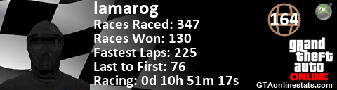 <a href="http://GTAonlinestats.com/showplayer/lamarog"><img src="http://GTAonlinestats.com/racesignature/lamarog/sig.png" alt="lamarog" border="0" /></a>