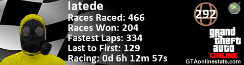 [URL=http://GTAonlinestats.com/showplayer/latede][IMG]http://GTAonlinestats.com/racesignature/latede/sig.png[/IMG][/URL]