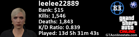 <a href="http://GTAonlinestats.com/showplayer/leelee22889"><img src="http://GTAonlinestats.com/signature/leelee22889/sig.png" alt="leelee22889" border="0" /></a>