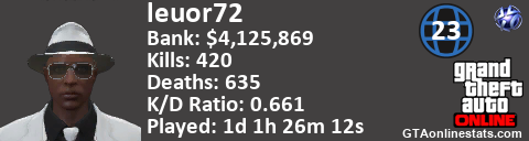 <a href="http://GTAonlinestats.com/showplayer/leuor72/2"><img src="http://GTAonlinestats.com/randomsignature/leuor72/2/sig.png" alt="leuor72" border="0" /></a>