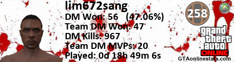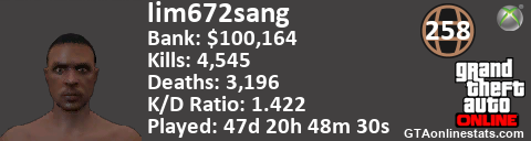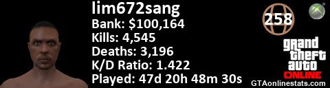 <a href="http://GTAonlinestats.com/showplayer/lim672sang"><img src="http://GTAonlinestats.com/randomsignature/lim672sang/sig.png" alt="lim672sang" border="0" /></a>